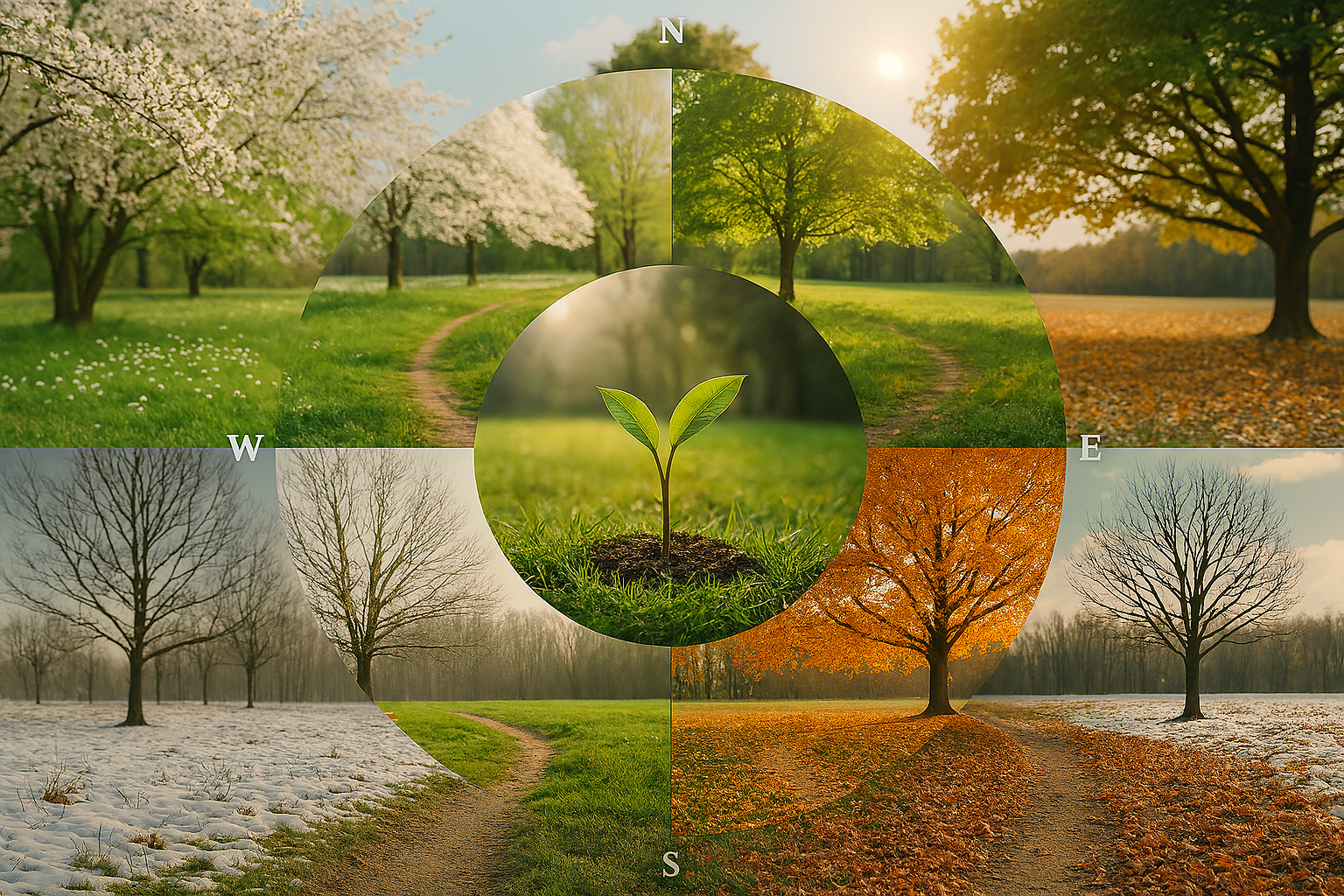 Daan van Kampenhout[1] beschrijft hoe je, aanvullend op de seizoenen, de vier windrichtingen (oost, zuid, west, noord) kunt gebruiken bij het benaderen van uitdagingen en groei in organisaties. Elke richting vertegenwoordigt een andere manier van kijken en handelen, die samen zorgen voor balans en een integrale aanpak.. Het stimuleert om niet alleen om niet alleen rationeel, maar ook intuïtief, relationeel en reflectief te werken. Zo ontstaat er ruimte voor groei, verbinding, integratie en wijsheid binnen de organisatie.